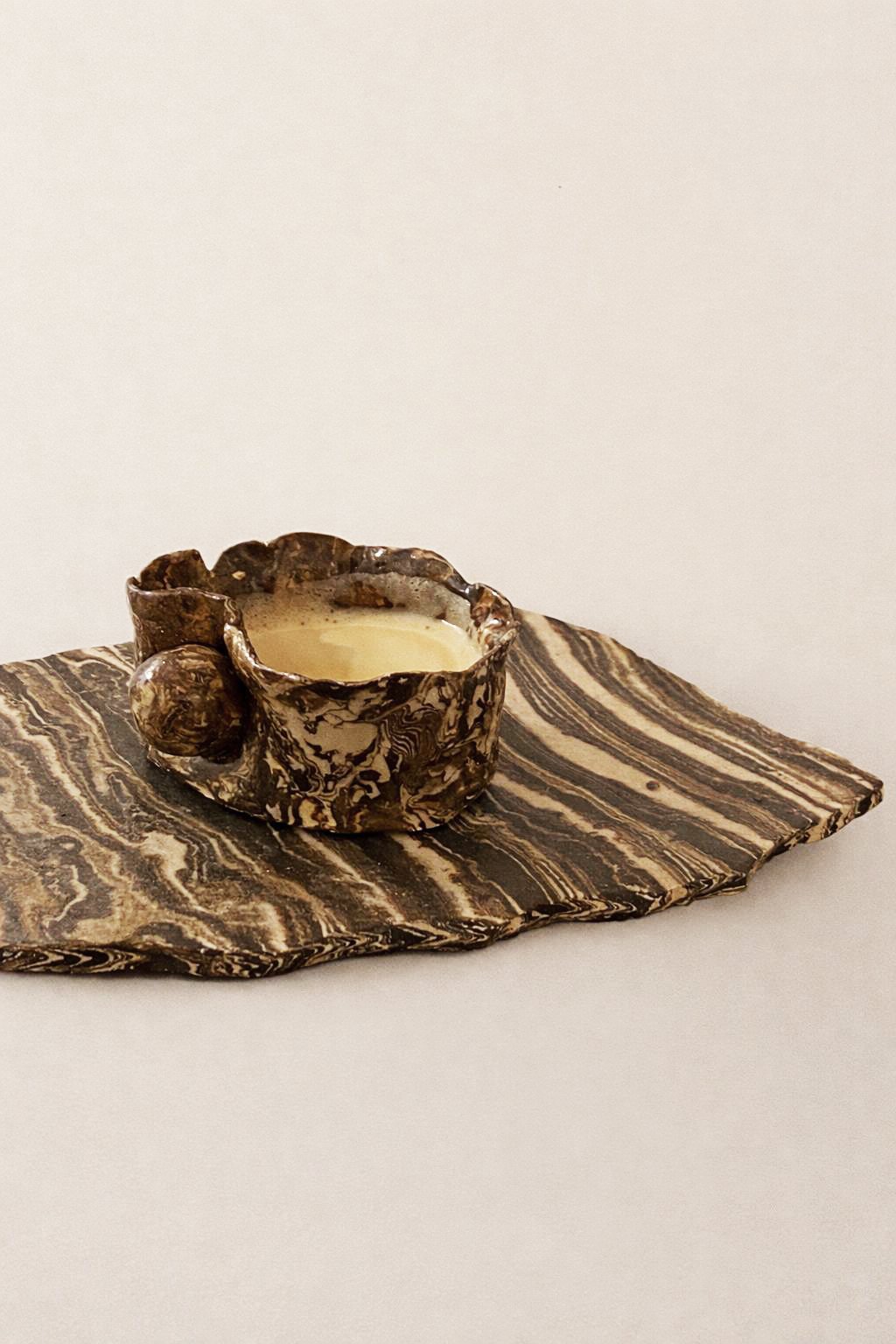 Ensemble plateau et tasse à café en terre mêlée
